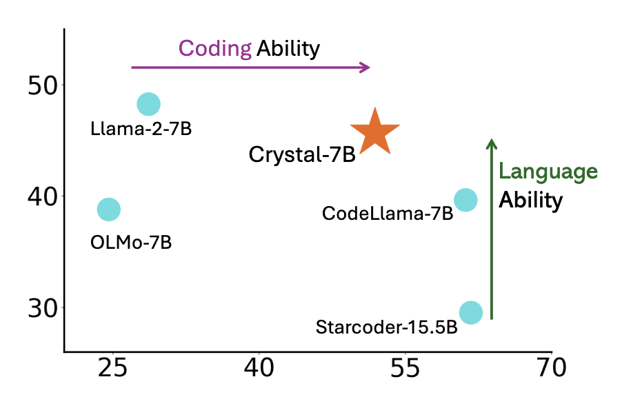 Unlike most previous code LLMs, Crystal is trained using a careful mixture of text and code data to maximize utility in both domains. Code data is introduced earlier during the pretraining process (as compared with Code Llama 2 which is fine-tuned on Llama 2 using entirely code data). Additionally, we trained Crystal on Python and web programming language, to improve its utility as a programming assistant. Our experiments show that Crystal achieves a balanced position between LLaMA 2 and Code LLaMA, but with fewer training tokens (LLaMA2 7B is trained on 2T tokens and Code LLaMA is trained with additional 600B tokens). The graph below plots the language and coding ability of each model based on the tables above. As evidenced by the evaluations, LLaMA 2 regresses in language ability when fine-tuned on code. More research is needed to fully understand the phenomena, but studying Crystal may offer some insights.