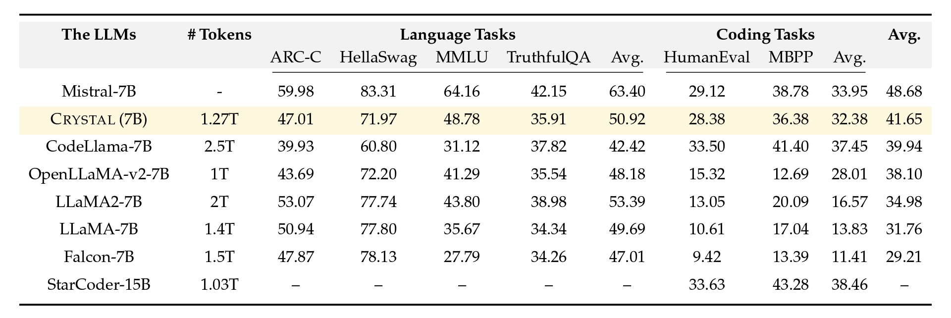 Figure 2: Evaluation comparisons among a few notable code and language models. The last column is the average of the language task average and the code task average. Crystal strikes a good balance between both language and code tasks.